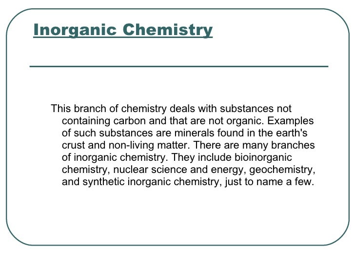 Inorganic Chemistry is one such discipline of science which is vibrating at high frequency under the impact of knowledge explosion. The scientific study of chemical substances that do not contain carbon 2. The study of all the.